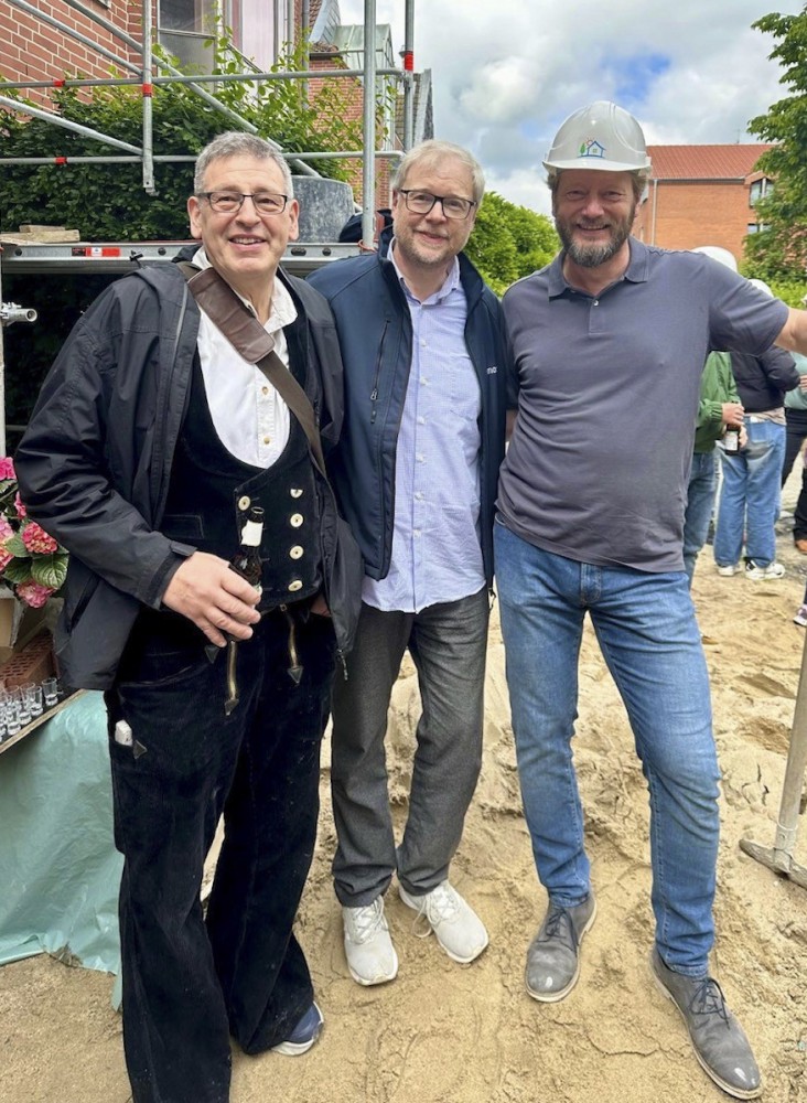 “Es ist gerichtet” – Dieser Spruch ist ein Meilenstein für jede Baustelle und wurde nun für das Mehrfamilienhaus in der Coesfelder Altstadt gebührend gefeiert. Ein traditioneller Kranz schmückte den fertiggestellten Dachstuhl und der Zimmermann hielt die Richtrede. Den letzten Nagel des Dachstuhls schlug traditionellerweise der Bauherr selbst ein, bevor mit Grillwürstchen und Bier der Richtschmaus folgte. Es freuen sich Bauherr Jochen Niewind ebenso wie HLK-Projektleiter Oliver Rasche.