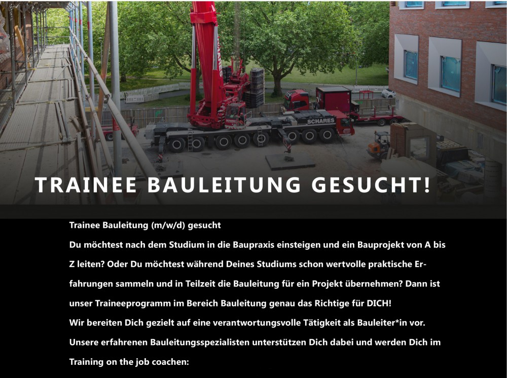 Du möchtest nach dem Studium in die Baupraxis einsteigen und ein Bauprojekt von A bis Z leiten? Oder Du möchtest während Deines Studiums schon wertvolle praktische Erfahrungen sammeln und in Teilzeit die Bauleitung für ein Projekt übernehmen?