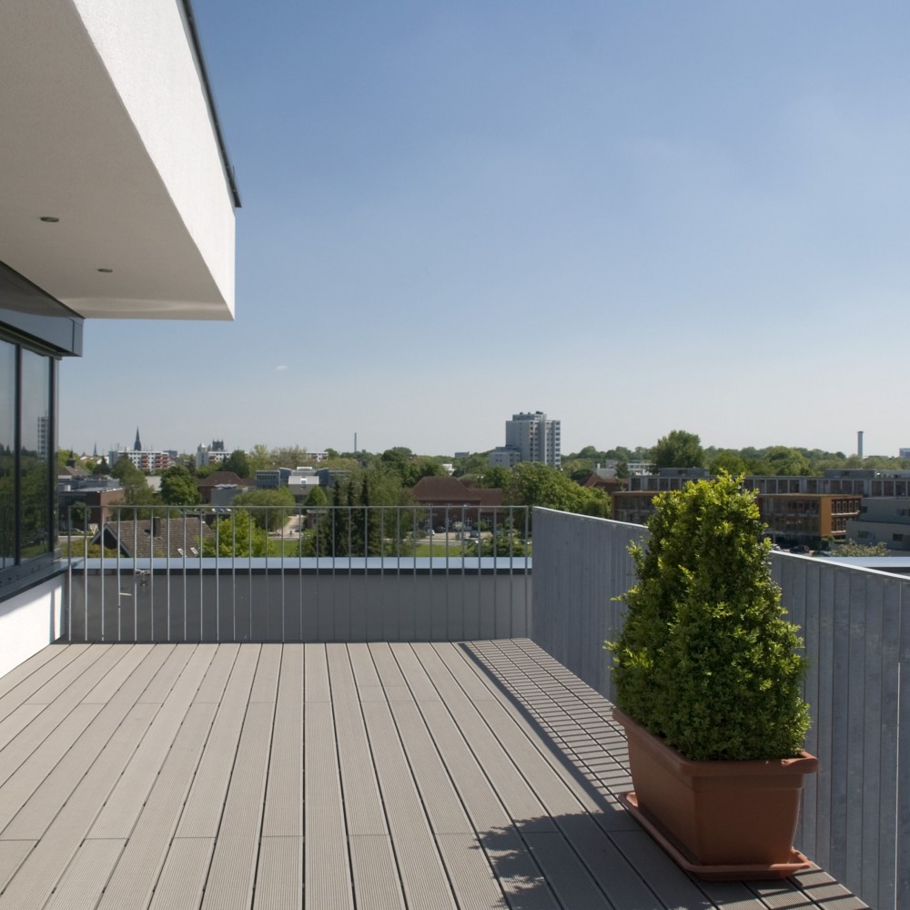 Trotzdem hat der schnörkellose Bau einige Besonderheiten zu bieten, zum Beispiel das oberste Staffelgeschoss, das den Konferenzbereich beherbergt. Hier findet sich auch eine Dachterrasse, die einen guten Rundumblick bietet. Die breite nördliche Fensterfront in Richtung Steinfurter Straße kann für Ankündigungen medial genutzt werden. Besonderes Augenmerk richteten wir auch auf die flexible Innenraumgestaltung. Dank der Leichtbauweise ohne tragende Innenwände können alle Büros variabel umgestaltet und auch vergrößert oder verkleinert werden. Dieser veränderbare Grundriss macht das Gebäude auch bei einem Mieterwechsel interessant.